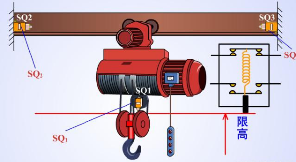 首先電葫蘆有兩個(gè)電機(jī)組成,分別是M1上 下,M2--左--右,左右的兩邊分別有限位器,就是行程開關(guān)用來限制導(dǎo)軌上面的電機(jī)不會(huì)因?yàn)檎`操作損毀設(shè)備。上的時(shí)候也有位置限制。